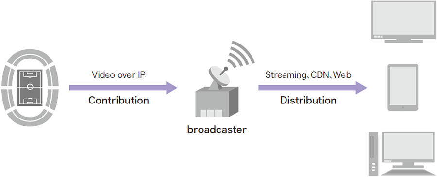 放送の仕組み、特にスポーツ中継を例にとって図示します(図-1)。スタジアムなど(よく英語でvenueと表現されます)で開催されるイベントは、当然ながら現場で撮影・収録する必要があります。この模様を放送番組に仕立てて放送やネット中継に供するには、venueで撮影された素材を放送局に伝送する必要があります。後日放送するのであれば、カメラで撮影したメモリカードやハードディスクを持ち運びすれば良いのですが、中継となると話は別です。放送局舎内での映像編集(例えばテロップ加工)もあるため、できるだけ高い品質を保ったまま、映像を放送局へリアルタイムで伝送する必要があります。このために、放送局では様々な手法が用いられています。マイクロ波中継や衛星中継などの基地局と中継局を用意するのが一般的です。お天気カメラなどは、安価なコンシューマ用回線が用いられたりしますし、緊急の場合は携帯キャリアのデータ通信が使われることもあります。あるいは映像専用の専用線サービスを通信キャリアから購入する場合もあります。一般的には品質を確保したい場合は安定した方法で、速報性が重視される場合は機動性が重視されています。これら広い意味でのネットワーキングを、業界では"Contribution"と呼んでいます。日本語では「集信」となるでしょうか。対比して、放送局から視聴者に届けられる区間、地上波やBS、CSやOTTの部分については"Distribution"と呼ばれています。これは「配信」ですね。