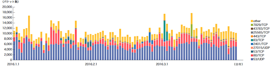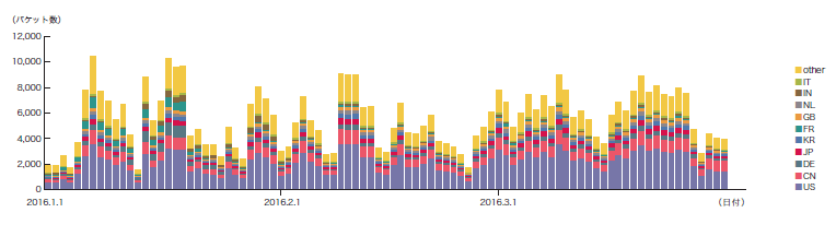 2016年1月から3月の間に観測したbackscatterについて、発信元IPアドレスの国別分類を図-3に、ポート別のパケット数推移を図-4にそれぞれ示します。