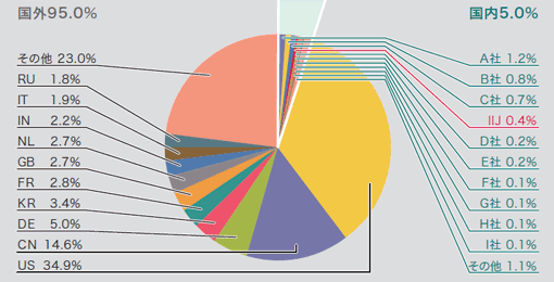 攻撃元の分布としては、多くの場合、国内、国外を問わず非常に多くのIPアドレスが観測されました。これは、IPスプーフィング(※24)の利用や、DDoS攻撃を行うための手法としてのボットネット(※25)の利用によるものと考えられます。