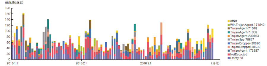 期間中の1日あたりの平均値は、総取得検体数が91、ユニーク検体数が14でした。未検出の検体をより詳しく調査した結果、台湾などに割り当てられたIPアドレスでWorm(※35)や、インドに割り当てられたIPアドレスでトロイの木馬(※36)などが観測されています。
