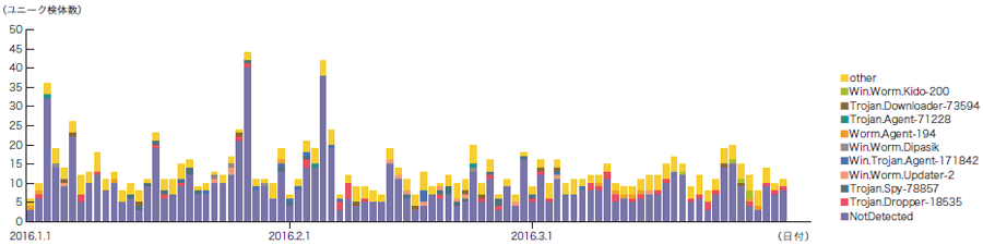 本レポート期間中、Confickerを含む1日あたりの平均値は、総取得検体数が11,902、ユニーク検体数は428でした。総取得検体数で99.5%、ユニーク検体数で96.8%を占めています。このように、今回の対象期間でも支配的な状況が変わらないことから、Confickerを含む図は省略しています。本レポート期間中の総取得検体数は前回の対象期間と比較し、約33%減少し、ユニーク検体数は前号から約11%減少しました。本レポート期間中、全体的に緩やかに減少していました。Conficker WorkingGroupの観測記録(※38)によると、2016年4月現在で、ユニークIPアドレスの総数は60万台とされています。2011年11月の約320万台と比較すると、約19%に減少したことになりますが、依然として大規模に感染し続けていることが分かります。