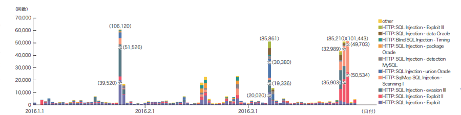 IIJでは、Webサーバに対する攻撃のうち、SQLインジェクション攻撃(※39)について継続して調査を行っています。SQLインジェクション攻撃は、過去にもたびたび流行し話題となった攻撃です。SQLインジェクション攻撃には、データを盗むための試み、データベースサーバに過負荷を起こすための試み、コンテンツ書き換えの試みの3つがあることが分かっています。