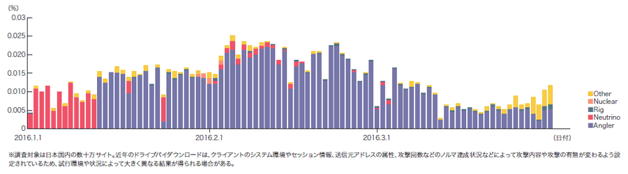 ダウンロードされるマルウェアは当初CryptoWall4.0が大部分を占めていましたが、2月中旬頃からTeslaCrypt3.0が取って代わりました。その他にNecurs、Bedep、Locky、Andromedaなどを検知しましたが、いずれも少数でした。特にLockyは同時期にメール経由での感染で大規模に拡散しているランサムウェアでしたが(※42)(※43)、ドライブバイダウンロードのペイロードとして検知したものは極めて少数で、期間も短いものでした。