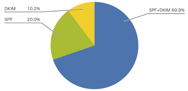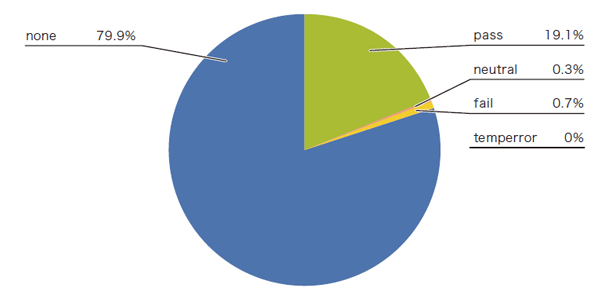 DMARCが「pass」のときに最も多いSPFとDKIMの認証結果のパターンは、両方とも「pass」だった場合で、その割合は69.8%でした。つまり、DMARCレコードを宣言していて、正しくDMARC認証が「pass」するドメインの多くは、SPFとDKIMを共に導入しているドメイン、ということが分かりました。SPFとDKIMのどちらか一方の認証が失敗している、あるいは導入していない場合で、そのもう一方が「pass」だったためにDMARCとしては「pass」だった場合は、SPFが「pass」だった割合の方が多く、20.0%でした。DKIMだけが「pass」だった割合はそのおよそ半分で10.2%でした。SPFの普及率の高さが、そのままDMARC認証の「pass」の結果に結びついた、と考えられます。
