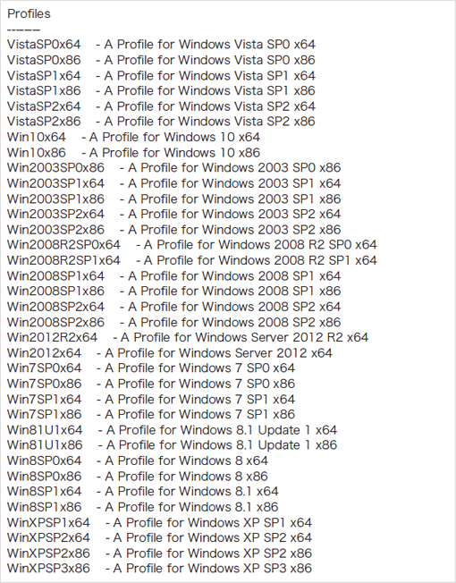 Volatilityを実行する際にはプロファイルを指定する必要があります。プロファイルは、OSやサービスパック、アーキテクチャごとに用意されており、メモリイメージを取得したシステムと同じものを指定しなければ正しく解析することができません。図-14はVolatilityにデフォルトで同梱されているプロファイルの一覧になります。