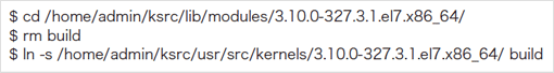 注意点として、CentOS 7の場合、/lib/modules/<kernel_ver>/buildのシンボリックリンクがリンク切れとなるため、makeを実行すると「/home/admin/ksrc/lib/modules/<kernel_ver>/buildは存在しない」旨のエラーが発生してしまいます。この場合、図-23のように、buildファイルのシンボリックリンクを張り直すことでエラーを回避することができます。
