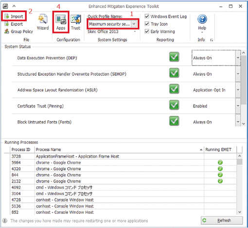 EMET(Enhanced Mitigation Experience Toolkit)は脆弱性の悪用を緩和するためのツールで、マイクロソフトが配布しています(※53)。Windowsのセキュリティ機能を最大限有効化すると共に、既知の攻撃手法への緩和策が実装されています。EMETはドメイン配下のクライアントに一斉インストールし、ポリシーを強制することも可能です(※54)。本稿執筆時点での最新版は5.5であり、それを元にEMETを単一ホストで利用する場合の説明します。インストール後、スタートメニューからEMET GUIを起動すると、EMETの管理ツールが起動します。