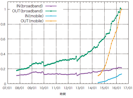 - (※1)長健二朗. ブロードバンドトラフィックレポート:ブロードバンドとモバイルのトラフィックを比較. Internet Infrastructure Review. Vol.28. pp28-33. August 2015.