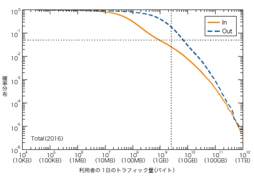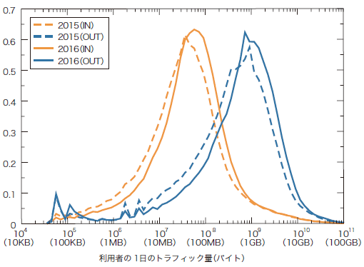 ブロードバンドのINとOUTの各分布は、片対数グラフ上で正規分布となる、対数正規分布に近い形をしています。これはリニアなグラフで見ると、左端近くにピークがあり右へなだらかに減少するいわゆるロングテールな分布です。OUTの分布はINの分布より右にずれていて、ダウンロード量がアップロード量より、ひと桁以上大きくなっています。2015年と2016年で比較すると、INとOUT共に分布の山が右に少し移動していて、利用者全体のトラフィック量が増えていることが分かります。右側のOUTの分布を見ると、分布のピークはここ数年間で着実に右に移動していますが、右端のヘビーユーザの使用量はあまり増えていないので、分布の対称性が崩れてきています。一方で、左側のINの分布は左右対称で、より対数正規分布に近い形です。