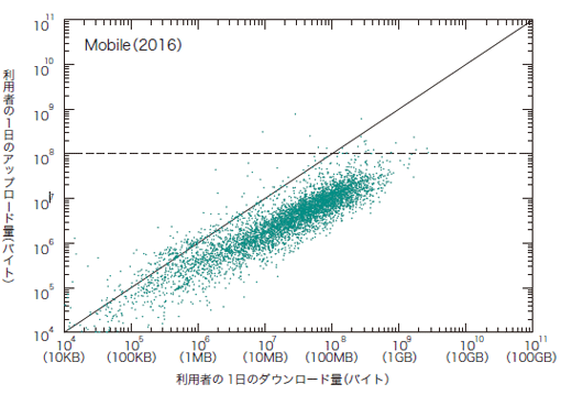 モバイルでは、表-2に示すように、ヘビーユーザが少ないため、平均と最頻出値がほぼ一致します。2016年の最頻出値は、INで7MB、OUTで63MBで、平均値は、INで7.8MB、OUTで63.0MBです。最頻出値の伸び率は、INで1.3倍、OUTで1.6倍となっています。図-4及び図-5は、利用者ごとのIN/OUT使用量を5,000人をランダムに抽出してプロットしています。X軸はOUT(ダウンロード量)、Y軸はIN(アップロード量)で、共にログスケールです。利用者のIN/OUTが同量であれば対角線上にプロットされます。対角線の下側に対角線に沿って広がるクラスタは、ダウンロード量がひと桁多い一般的なユーザです。ブロードバンドでは、以前は右上の対角線上あたりを中心に薄く広がるヘビーユーザのクラスタがはっきり分かりましたが、今では識別ができなくなっています。また、各利用者の使用量やIN/OUT比率にも大きなばらつきがあり、多様な利用形態が存在することが窺えます。ここでは、2015年と比較しても、ほとんど違いは確認できません。