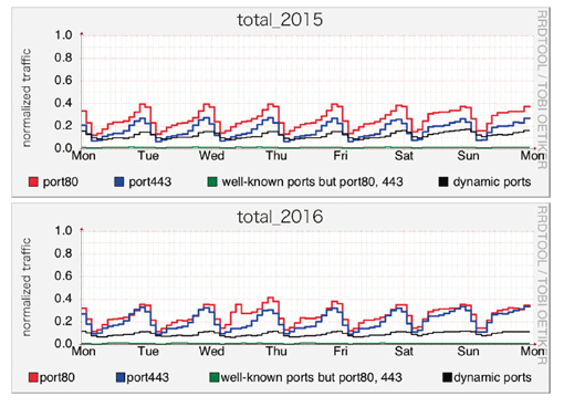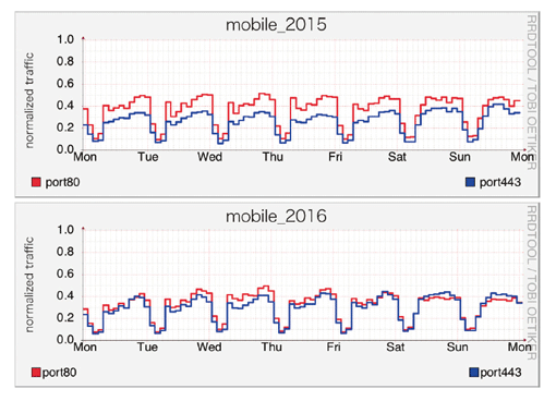 図-8は、ブロードバンド全体トラフィックにおけるTCPポート利用の週間推移を、2015年と2016年で比較したものです。ここでは、TCPのポート利用を80番、443番、その他のウェルノウンポート、動的ポートの4つに分けてそれぞれの推移を示しており、ピーク時の総トラフィック量を1として正規化して表しています。2015年と比較すると、全体でも443番ポートの割合が更に増え、動的ポートの利用が減少している傾向が確認できます。全体のピークは21:00から翌1:00、土日には昼間のトラフィックが増加していて、家庭での利用時間を反映しています。今回、水曜の午前に80番ポートのトラフィック増加が見られますが、これはマイクロソフトの自動更新プログラムの影響だと思われます。図-9のモバイルでは、トラフィックの大半を占める80番ポートと443番ポートについて推移を示します。ブロードバンドに比べると、朝から夜中までトラフィックの高い状態が続きます。平日には、朝の通勤時間、昼休み、夕方から夜中にかけての3つのピークがあり、ブロードバンドとは利用時間の違いがあることが分かります。