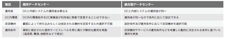 IT機器も含めたシステム化を検討できるデータセンターの利用形態は、データセンター運用者とITシステム運用者が密接に関連しているもしくは同一であるデータセンターに限られるため、ここでは簡単に「統合型データセンター」と呼びます。既存データセンターと統合型データセンターの差異を表-1に示します。