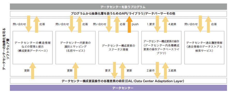 などを組み合わせることでデータセンターとITシステムの親和性を高める研究を進めています。図-1にデータセンターを扱うためのソフトウェア群の構成要素を示します。