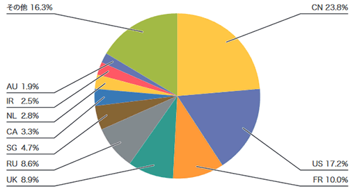 図-3で、DDoS攻撃の対象となったIPアドレスと考えられるbackscatterの発信元の国別分類を見ると、中国の23.8%が最も大きな割合を占めています。その後に米国の17.2%、フランスの10.0%といった国が続いています。