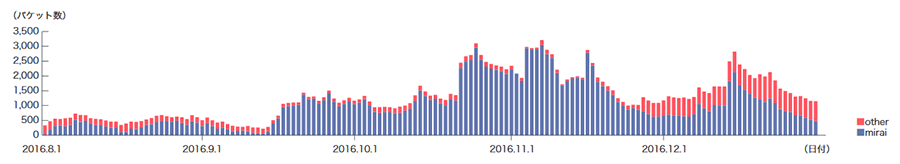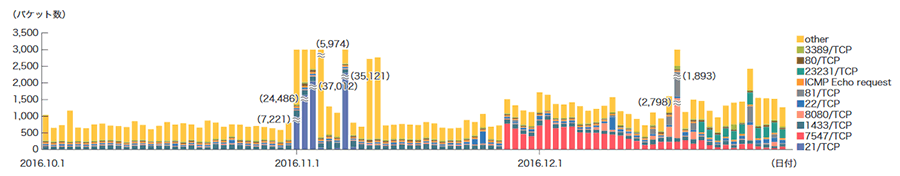 前回のレポートに引き続き、Telnetで使われる23/TCP宛ての通信が本レポート期間中でも引き続き高い値を示しており、更に10月後半から11月中旬までと12月中旬以降はより増加しています。これは前回レポートしたとおり、Miraiボット(※49)及びその亜種、Bashlite、KaitenやhajimeなどといったIoT機器のLinuxをターゲットにしたボットの感染が拡がっているためです。この通信は台湾、中国、ベトナム、韓国、ブラジルなどに割り当てられた多数のIPアドレスからの通信でした。また2323/TCP、7547/TCP、23231/TCPなどについてもMiraiボットやその亜種の影響であり、本レポートの期間中、大幅に増加しています。