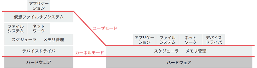 図-1 モノリシックカーネルとエクソカーネルの概念の比較(※1)