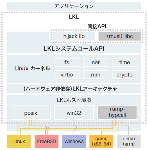 Linux Kernel Library(LKL)は、2007年頃より開発が始まった、Linuxカーネルのソースコードを変形させたライブラリです。Linux上のユーザ空間のプログラムがリンクして利用したり、Windows上のプログラムも利用したりすることができるように、動作環境のOSやハイパーバイザなどの下層部を隠蔽するための抽象層を、元のLinuxカーネルのソースコードに対して導入しています。