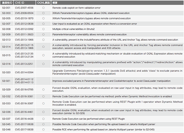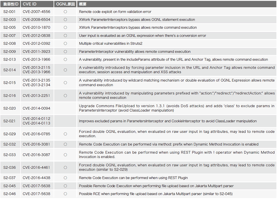 表-1 Struts2 リモートコード実行可能な脆弱性