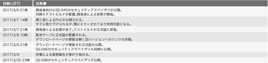 表-2 Struts2の脆弱性CVE-2017-5638(S2-045, S2-046)に関連するタイムライン