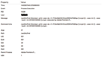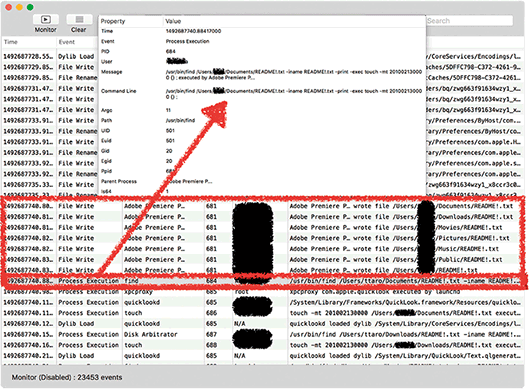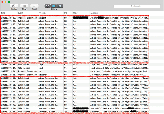 monitor.appのモニタリングログを表示し、「Adobe Premiere Pro CC2017 Patcher」の起動を示すログを探します。ここでは、該当アプリケーションが実行され、続けて関連するdylib(※71) ファイルがロードされているログが確認できます(図-19)。