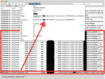 ここで、monitor.appのモニタリングを停止し、ログの調査を始めます。なお、ファイルメニューの「Save As...」を選択することで、ログをファイルとして出力することも可能です。また、実行前にデスクトップに置かれていたファイルはパスフレーズ付きZIPアーカイブとして保存されていることが確認できます(図-18)。