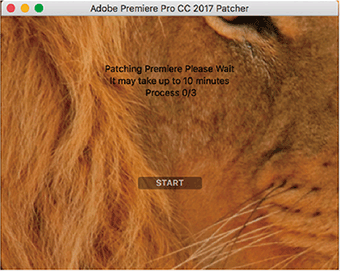 monitor.appを起動し、モニタリングを開始した状態で、Patcher アプリケーションのアイコンをダブルクリックして起動します。本稿で扱う検体は、アプリケーション名が「Adobe Premiere Pro CC 2017 Patcher」と偽装されています(図-16)。起動すると、背景が透過に設定されたアプリケーションウィンドウが展開し「START」ボタンをクリックするよう促すメッセージが表示されるので、クリックして先に進みます。
