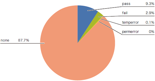 IIJのメールサービスでは、受信したメールについてDMARC 認証を行っています。図-2に示したグラフは、直近の2017年4月に受信したメールのDMARCの認証結果の割合を示したものです。認証結果"none"は、受信したメールの送信ドメインが、DMARCを導入していなかったことを示す認証結果です。"none"が87.7%ですので、9割近い受信メールがまだDMARC に対応していないこと示しています。