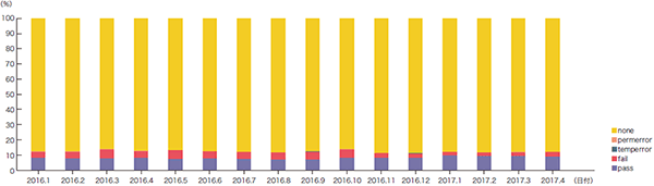 次に、2016年1月からの認証結果割合の推移を図-3に示します。残念ながら"none"の割合が87%前後で推移しており、ほとんど変化のない結果となりました。既にSPFやDKIMを導入していれば、DMARCレコードを記述するだけで送信側のDMARCは導入できたことになりますので、こうした認証率の低さは、DMARCが国内であまり認知されていないことを示しているものと考えています。