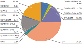 いずれかの認証結果が"pass"だったものは、そのまま示しています。例えば"DMARC+SPF+DKIM"のデータ項目は、DMARC とSPFとDKIMのすべての認証結果が"pass"だったことを示しています(グラフでは6.7%の割合)。逆に"!()"で括られたデータは、いずれの認証結果でも"pass"だったものはなく、逆に"fail"などの認証が失敗した認証技術の組み合わせを示しています。例えば、"! (SPF)"のデータ項目は12.5%ありますが、 これはDKIMとDMARCでは認証できなかった(認証結果としては"none")が、SPFだけの認証結果が失敗なもの、つまり"hardfail"、"softfail"、"neutral"のいずれかの認証結果だったことを示しています。