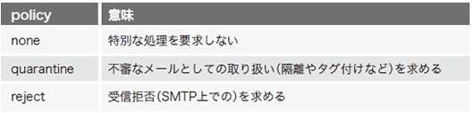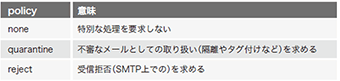 SPFかDKIMを導入しているのであれば、最初の設定としては、これで十分です。パラメータ"p="の意味は、認証が失敗した場合に送信側から受信側に求める処理のポリシーを示す値で、表-2の値が設定できます。"none"は隔離や受信拒否などを求めない値となりますので、仮にSPFやDKIM、DMARCで認証失敗したとしても、正しくDMARCの仕様に沿った処理をする受信側に対しては、悪影響はありません。このように、送信側メールサーバのIPアドレスなどを調べる必要もありませんので、SPFレコードより簡単に設定することができます。
