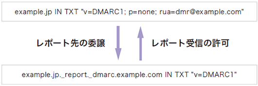図-5は、"example.jp"のレポートの委譲先に"example.com"を指定した場合です。この場合、"example.com"側では、"example. jp"のDMARCレポートを受け取ることを示すために、"example. jp._report._dmarc.example.com"にTXT資源レコードに"v=DMARC1"を設定します。レポートを送信するメール受信側は、送信時にDNSを参照することで委譲関係を確認します。
