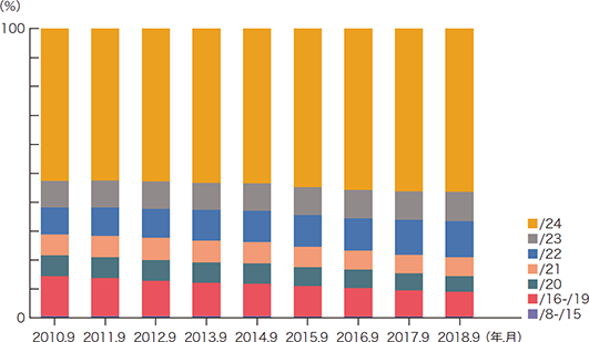 図-1「 IPv4 フルルート」に占める各プレフィクス長経路数の比率の推移