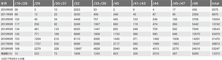 次に「IPv6フルルート」の情報を確認します(表-2)。こちらも経路総数は過去8年間で最大の増加となりました。但し総数の74%はプレフィクス長が/33 ~/48の経路で占められ、更にその76%以上は割り振り(/割り当て)ブロックを分割しての経路広報によるものと計算されます。経路数はIPv6普及の目安の1つになりますのでその増加は望ましいことですが、分割広報が全体の半数を超える現状は「経路広報を集約することで経路表の増大を抑制する」という初期にあったIPv6の理想(?)から程遠く、少々残念でもあります。