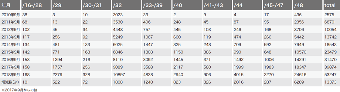 経路総数は過去8年間で最大の増加となり70万経路を超えました。またプレフィクス長ごとで見ると/22及び/23経路の増加率が10%を超えており、これらに/24経路を足した計3プレフィクスで経路増加数の89%、経路総数の79%を占めるまでになりました。移転を目的としたアドレスブロックの分割が更に進むに従ってこれらのプレフィクスの占める割合がどこまで伸びるのか、今後も注視したいと思います。