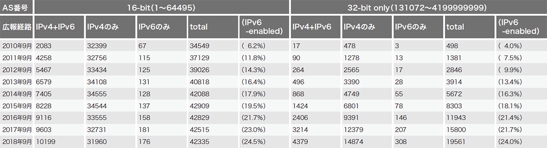 最後に追加で「IPv4/IPv6フルルート」広報元AS(Origin AS)の数も見ておきましょう(表-3)。IANAの16-bit AS番号poolが2016年7月に枯渇していることもあり、16-bit AS番号のOrigin AS数は同年から減少に転じています。一方の32-bit only AS番号(2007年1月割り当て開始)のOrigin AS数は順調に増加を続けていますがその大多数はIPv4のみで運用されているようです。これは、IPv4アドレス在庫が既に枯渇した状況下でAS番号を取得しBGP運用を開始したであろう新規組織であっても多くはIPv6の利用を考慮しない、という問題を示していると考えられ、IPv6の普及はまだまだ先が長いという現状が見て取れます。とはいえIPv4アドレスの取得がこの先より難しくなっていくであろうことは間違いありませんのでこの状況が今後も継続するのか否か、こちらも注視していきたいと思います。