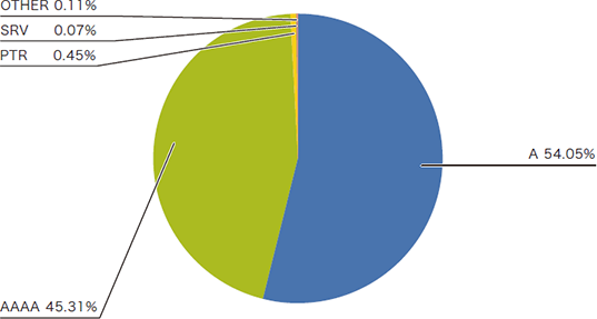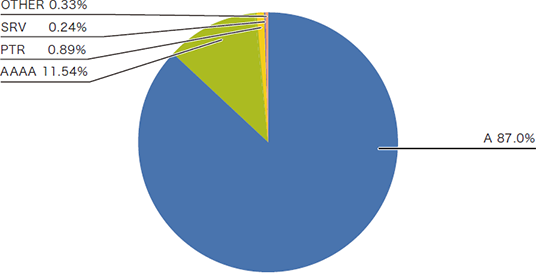 問い合わせレコードタイプに注目すると、ホスト名に対応するIPv4アドレスを問い合わせるAレコードとIPv6アドレスを問い合わせるAAAAレコードがほとんどを占めています。昨年と比べるとANYタイプの問い合わせが減少しています。