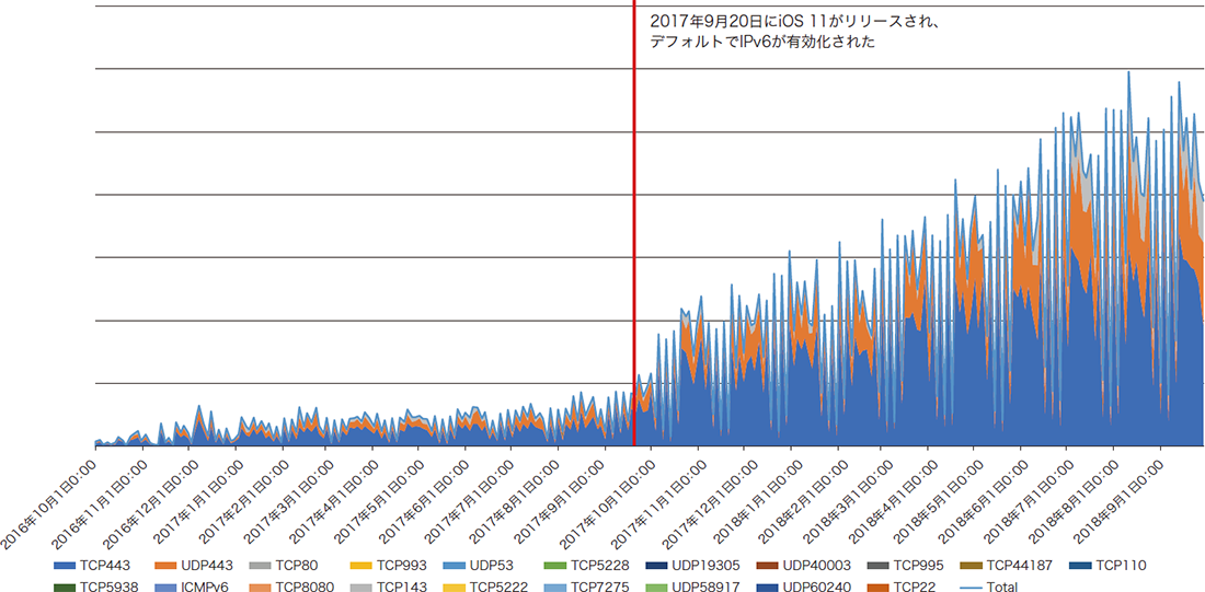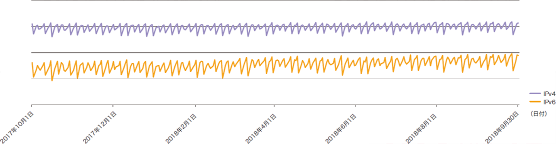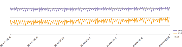 これは、米Apple社のiPhoneやiPadのOSであるiOSバージョン11のリリースと重なります。iOSバージョン11では、MVNOのAPNプロファイル(モバイル網に接続するための情報ファイル)でも、デフォルトでIPv6接続が有効化されたことから、多くのユーザの端末でIPv6が利用され始めたためと考えられます。