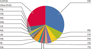 1位は昨年同様の事業者ですが、2位以降とのトラフィック量の差が縮小し、占有率は前回と比べ半分程度まで下がっています。2位以降の事業者においてもIPv6の活用が進んでいることがうかがえます。また、フレッツ光ネクストでIPv6 IPoE接続サービスを提供している事業者のトラフィックも4位と6位に入ってきており、IPv6 IPoEの普及がIPv6の利用増につながっているものと考えられます。