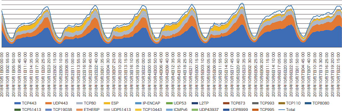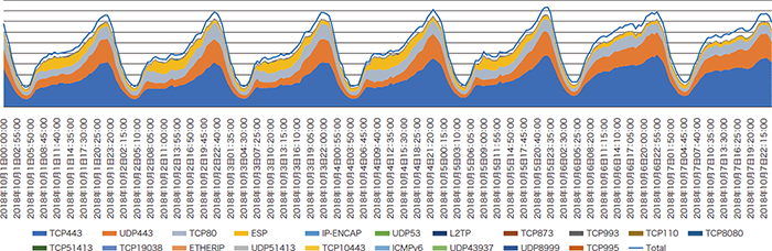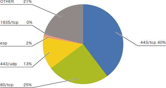 モバイルとブロードバンド、いずれもHTTP関連プロトコル(443/tcp及び80/tcp)が全体の約3/4を占めています。また、443/udpを使うQUICという比較的新しいプロトコルも上位に入っています。なお、QUICの通信先は特定のインターネットサービス事業者に著しく偏りが見られます。興味深いのは、ブロードバンドよりもモバイルの方が443/tcp、つまりはHTTPSの割合が高い点です。モバイル利用者の多くはスマートフォンを使用していると推測されますが、単純にWebページを汎用的なブラウザから閲覧するよりも、ある用途に特化した様々な専用アプリケーションを使う機会が多く、そこで利用されるプロトコルは多くがHTTPSであるのかもしれません。