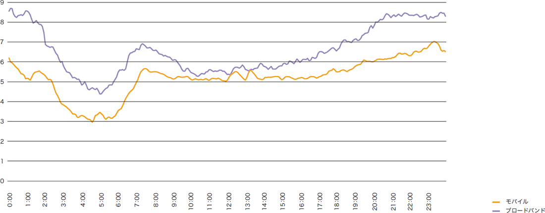 また、モバイル、ブロードバンド共にダウンロードの方が1日を通じた変動が大きくなっています。ブロードバンドは朝方から夜のピークにかけて徐々にトラフィックが増え続ける傾向にあり、一方のモバイルはブロードバンドと比べ、朝になると急激に増え、その後も日が変わる直前まで利用が多いことが分かります。