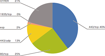 昨年と同様の傾向ですが、TCP/UDP443、TCP80が全体に占める割合が更に増加し、トラフィックのほとんどがWeb系のアプリケーションで占められています。これはIPv6に限らず、IPv4も同様の傾向です。