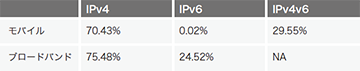 モバイルには一定数、IPv6のみを利用しているユーザがいます。IPv6でもIPv4と同等にコンテンツを提供するサービスも増えていますので場合によってはIPv6のみで需要を満たせるケースがあるかもしれませんが、これだけのユーザがいるのには驚かされます(端末によってはIPv4/IPv6同時利用の設定を行うと何故かIPv4、IPv6を別々に接続することがあり、この影響も考えられます)。