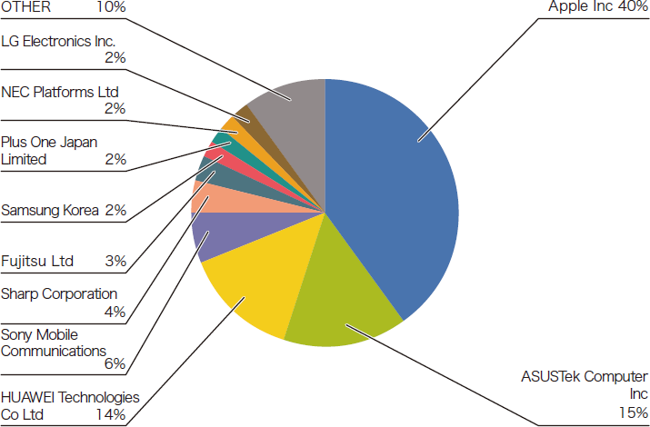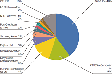 図-15は、メーカ別の割合を示したものです。世界の中でも日本は特にApple社の比率が高いと言われていますが、IIJの個人系モバイルサービスでも4割近くを占めています。IIJではスマートフォンの販売を行っていますが、Apple社の製品は扱っていないにもかかわらずこれだけの割合を占めることは驚異的であり、ユーザにとっていかに魅力的な端末であるかが分かります。