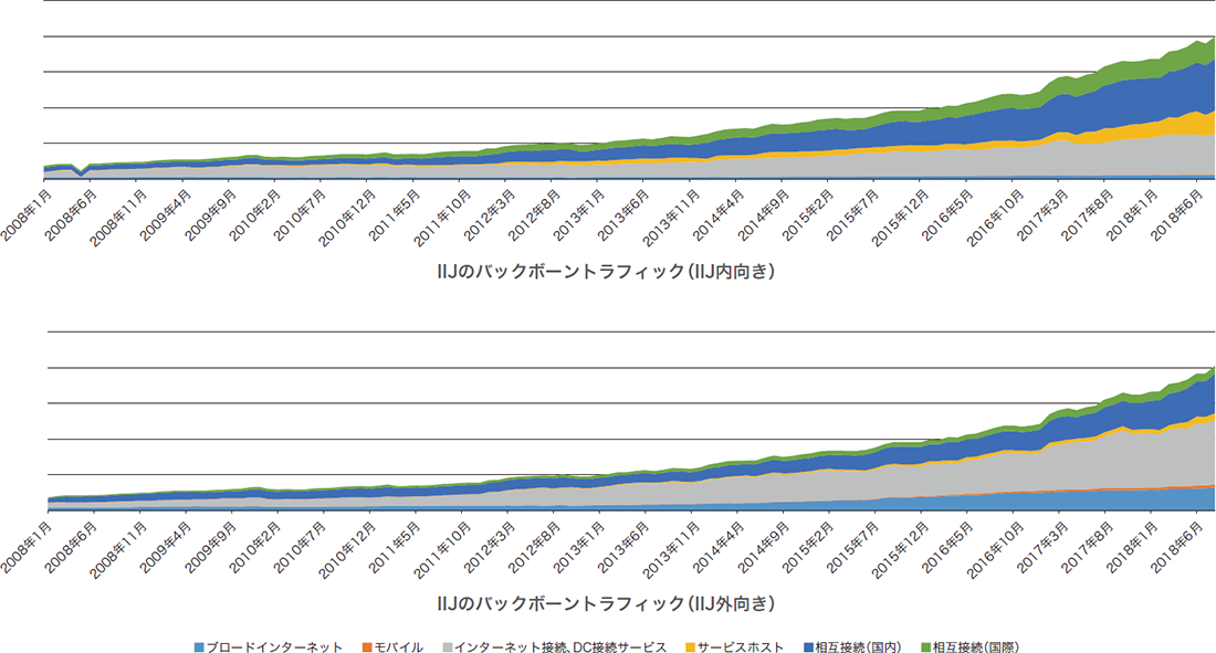 まず、一見して分かるのはトラフィックがこの10年で10倍以上になっていて、伸びが加速していることです。留まる気配はなさそうです。外向きのトラフィックに関しては、下の3つがお客様に向かうトラフィックです。モバイルのトラフィックが3年程前から徐々に増えてきていますが、割合的にはまだまだ少ない状況です。かなり大雑把ですが、ブロードバンドとモバイルのトラフィックは大部分が個人のお客様です。着実に増えていますが、灰色の主に法人のお客様(個人向けにサービスを行っている法人のお客様も含まれます)のトラフィックの方がこの10年の伸び率は高いです。IIJのお客様のトラフィックに関しては、個人よりも法人の方が伸びているのです。