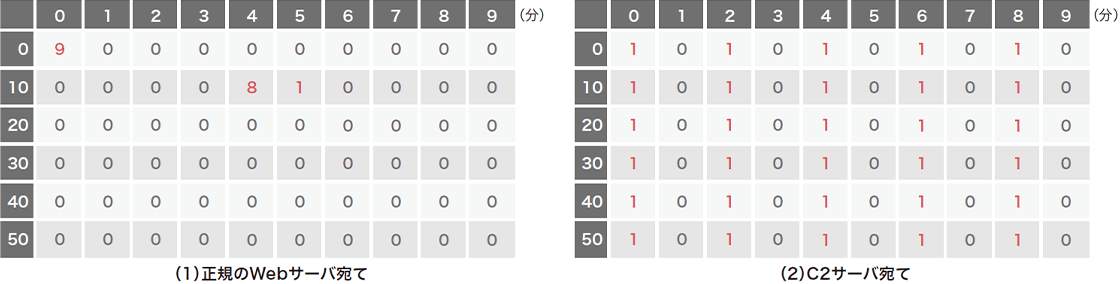 BOTやRATなどのマルウェアは、C2サーバに定常的にアクセスを行い、攻撃者からの命令を取得して実行するという特性があります(図-1)。多くの場合、ポーリング間隔は数十秒から数分程度です。この間隔が長いほど、一命令あたりの待ち時間が長くなるため、攻撃者は活動しづらくなります。反対に、間隔が短ければ攻撃者は活動しやすくなりますが、単純に宛先ホスト別に通信回数を分析するだけで上位に来るため、防御側が発見しやすくなります(※3)。つまり、攻撃者にとって通信頻度の調整は重要かつ変更しづらい特徴であると言えます。一方で、組織内の一般ユーザがWebアクセスなど外部と通信を行う場合、頻繁に、かつ長時間アクセスすることは稀です。図-2は、1時間あたりにユーザが無害なWebサーバにアクセスした場合のイメージ図(左)とマルウェアがC2サーバと定期的に通信を行った場合のイメージ図(右)です。ほとんどの場合、このように通信パターンに違いが出るため、このパターンの違いを学習できればマルウェアの通信を検出できると考えました。この方法はDNS名、IPアドレスやURLなどに依存していないので、既存の検知手法で見逃しても本手法で検知することができます。