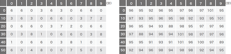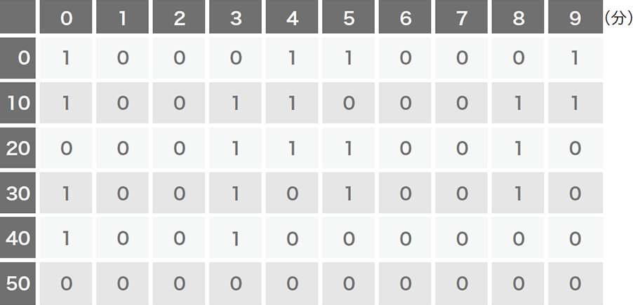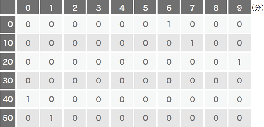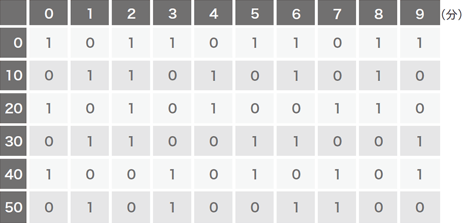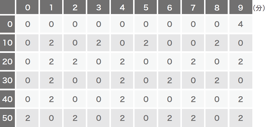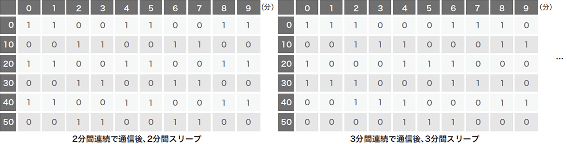 学習データセットは、良性サンプルにはWebプロキシログを変換した150万枚を超える「画像」を使用し、悪性サンプルには実際のマルウェアの通信パターンは一切使わず、定期的な通信パターンをエミュレートしています。これにより、検体を入手できなくても想定可能な悪性パターンを生成し、学習するだけでマルウェアを検出できます。これがBlack Hatで発表した際の副題に含まれている「Zero Knowledge」にかかっています。エミュレートしたインターバルは3秒から12分まで幅広く取り(図-3)、それに加えて特殊ケースとして数分間連続で通信した後、数分間スリープするようなパターンも生成しています(図-4)。更に、想定するパターンから少しだけ異なるパターンが出現した場合やCNNに対する攻撃(※4)の耐性を上げるために、生成したパターンを1ドットずつずらすローテーション、もしくは既存の値をランダムで一部クリアするなどして、合計で約100万枚のパターンを生成しました。