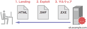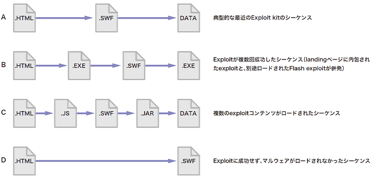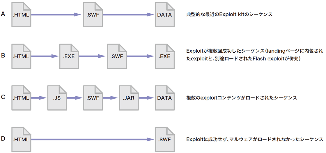 Webを閲覧しているPCがExploit kitに誘導されたとき、Exploit kitのサーバは図-10の順にコンテンツを送信します。