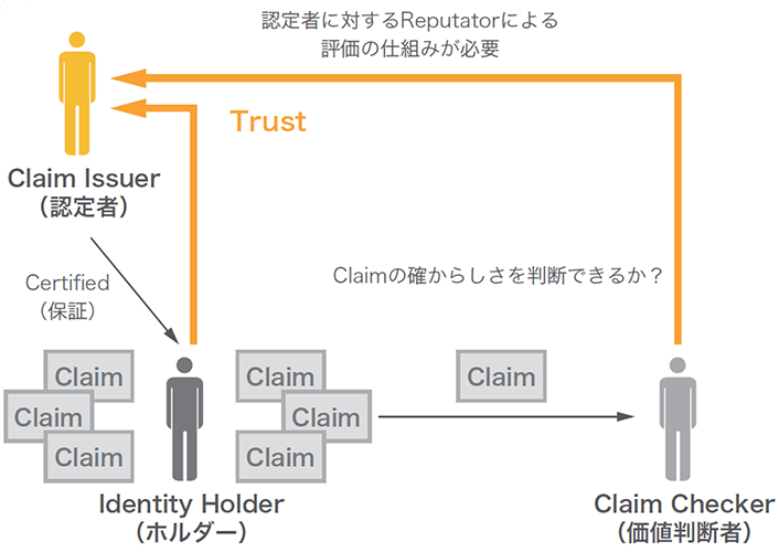 このような背景から、非中央集権型識別子Decentralized Identifiers(DIDs)という概念が登場しています。ある特定のレルムだけで有効なIDではない点、そしてIDを一括管理する中央集権的な存在を持たないという特徴を持ちます。これは非営利団体であるSovrin Foundation(※24)で提唱された自己主権型アイデンティティSSI (Self Sovereign Identity)(※25)との親和性が高いと認識されています。SSIは自己情報コントロール権の考えとよく似ていて、管理当局を介さずに自分自身でアイデンティティ情報の所有と管理を行う必要があることを認識するために使用される用語です。先に挙げたERC-735 Claimなどのクレデンシャルは意図せずひとりでに流通してしまう可能性があります。そうではなく自身のクレデンシャルの流通の主権をIdentity Holderが持とうという考え方です。