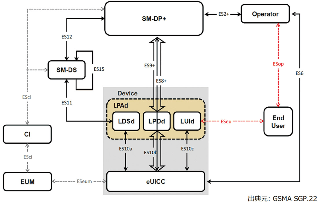 コンシューマモデルは、M2Mモデルの次に策定された仕様です。スマートフォンなど、エンドユーザが直接操作するデバイスが対象で、eSIMの操作はすべてデバイス上で行えるようになっています。コンシューマモデルの構成要素を図-3に示しますが、主要な構成要素は以下の通りです。