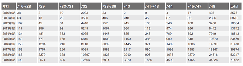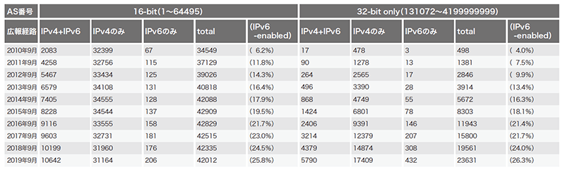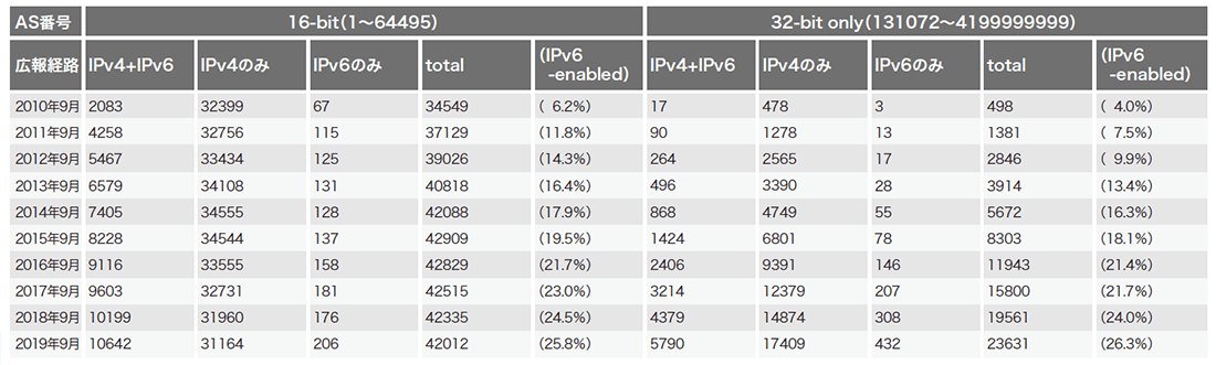 最後に「IPv4/IPv6 フルルート」広報元AS(Origin AS)数を確認します(表-4)。16-bit AS番号Origin ASの減少数、32-bit onlyAS番号Origin ASの増加数、共に過去9年間で最大となりました。またIPv6経路を広報するAS("IPv6-enabled")が全体の1/4を初めて超えました。RIPE NCCのIPv4アドレス在庫が2020年を待たずに完全に枯渇するとの予測も出ており、次回どうなるのか楽しみです。